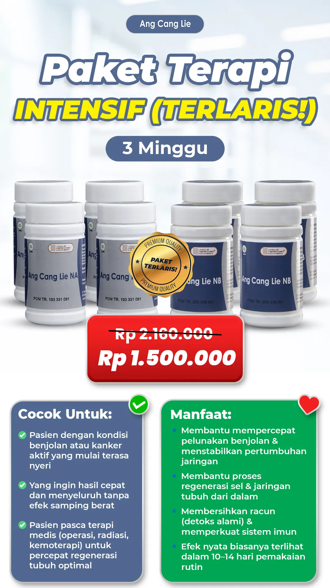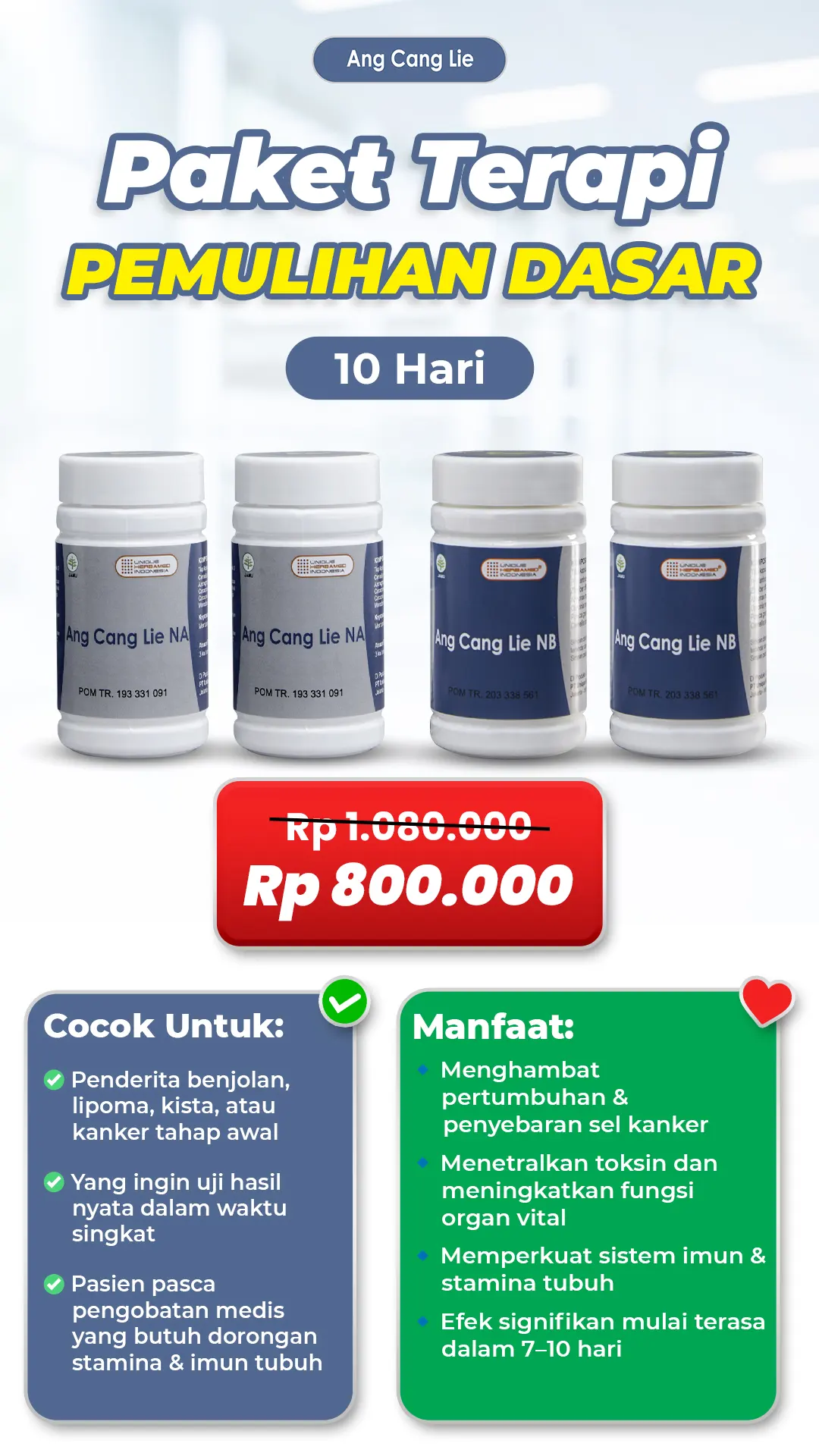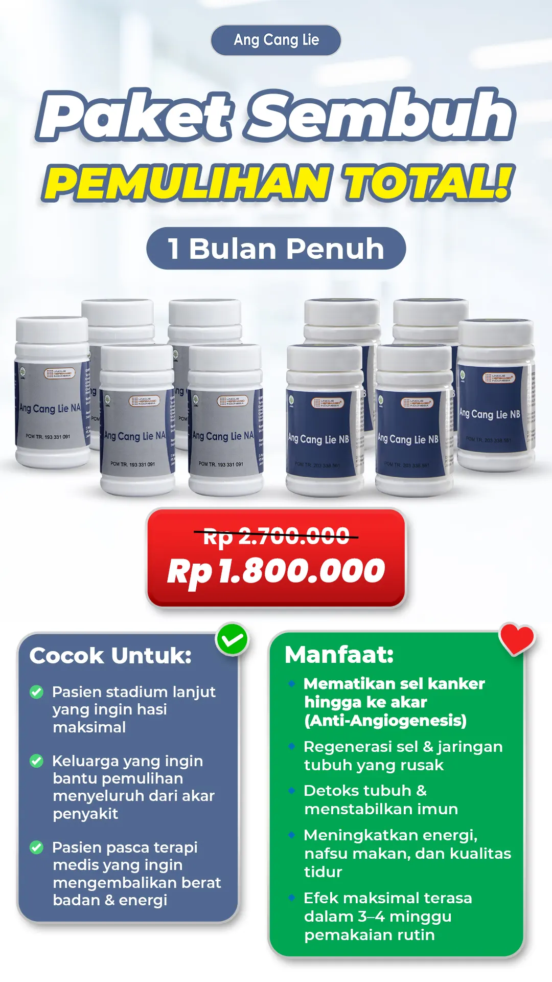 Dari pencarian itu, saya kenal Ang Cang Lie. Yang membuat saya setia di produk ini bukan janji instan, tapi cara kerjanya masuk akal. Ang Cang Lie bekerja dengan mekanisme antiangiogenesis, membantu mengganggu suplai nutrisi dan oksigen yang dibutuhkan sel abnormal untuk bertahan. Ketika suplai terganggu, sel abnormal melemah dan tidak mudah berkembang, sementara tubuh dibantu untuk memperkuat daya tahan dan memulihkan kondisi secara bertahap. Ang Cang Lie diformulasikan dari ekstrak herbal terstandar dan tersedia dalam dua varian yang saling melengkapi.