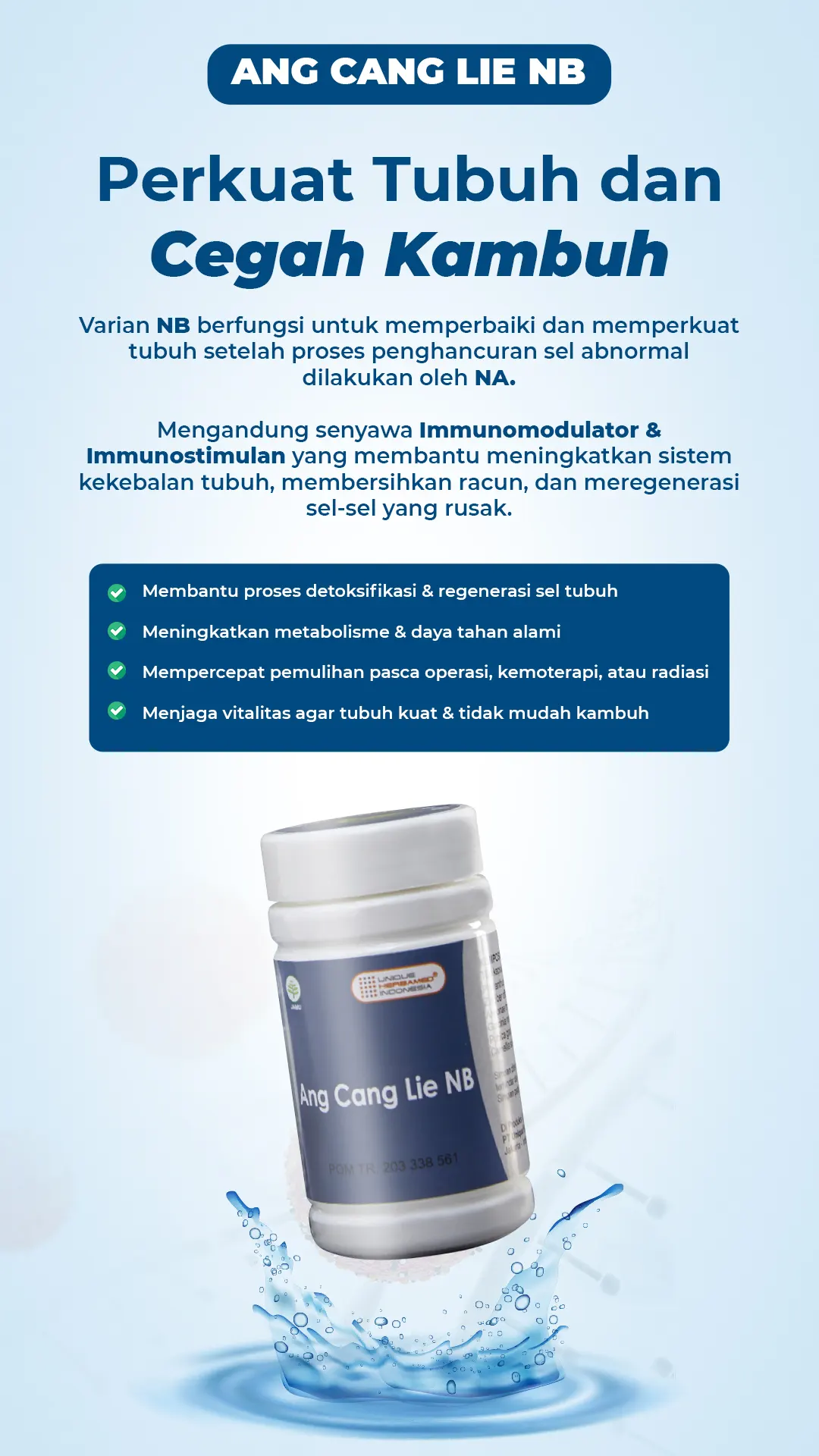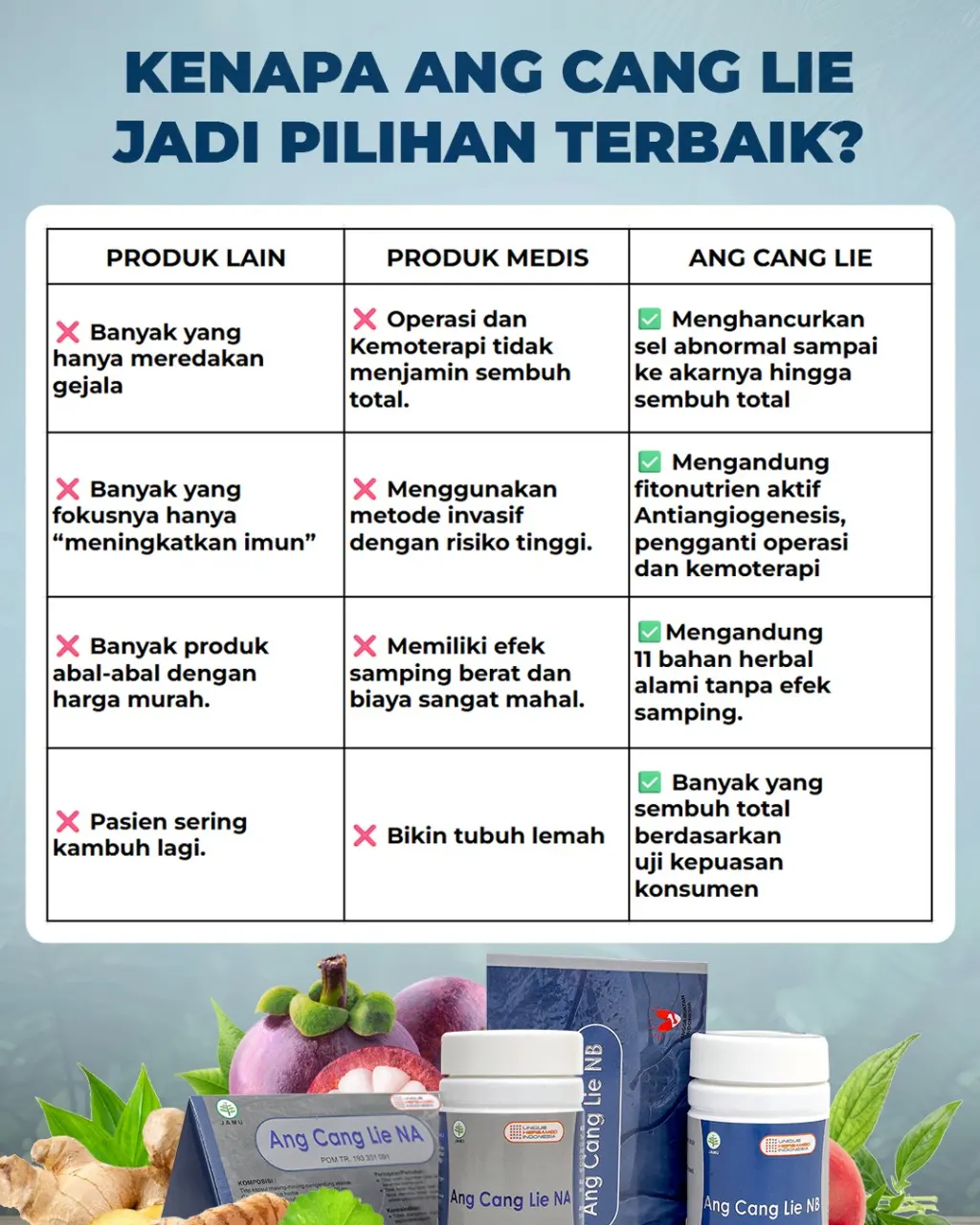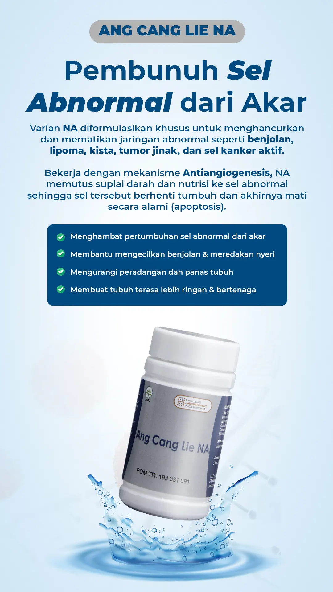 Ang Cang Lie adalah suplemen herbal berbahan alami yang diformulasikan dengan teknologi Herbal Medis Antiangiogenesis konsep modern yang membantu tubuh menjaga keseimbangan pertumbuhan sel, mendukung sistem kekebalan alami, dan membantu proses pemulihan tubuh secara bertahap dari dalam.
