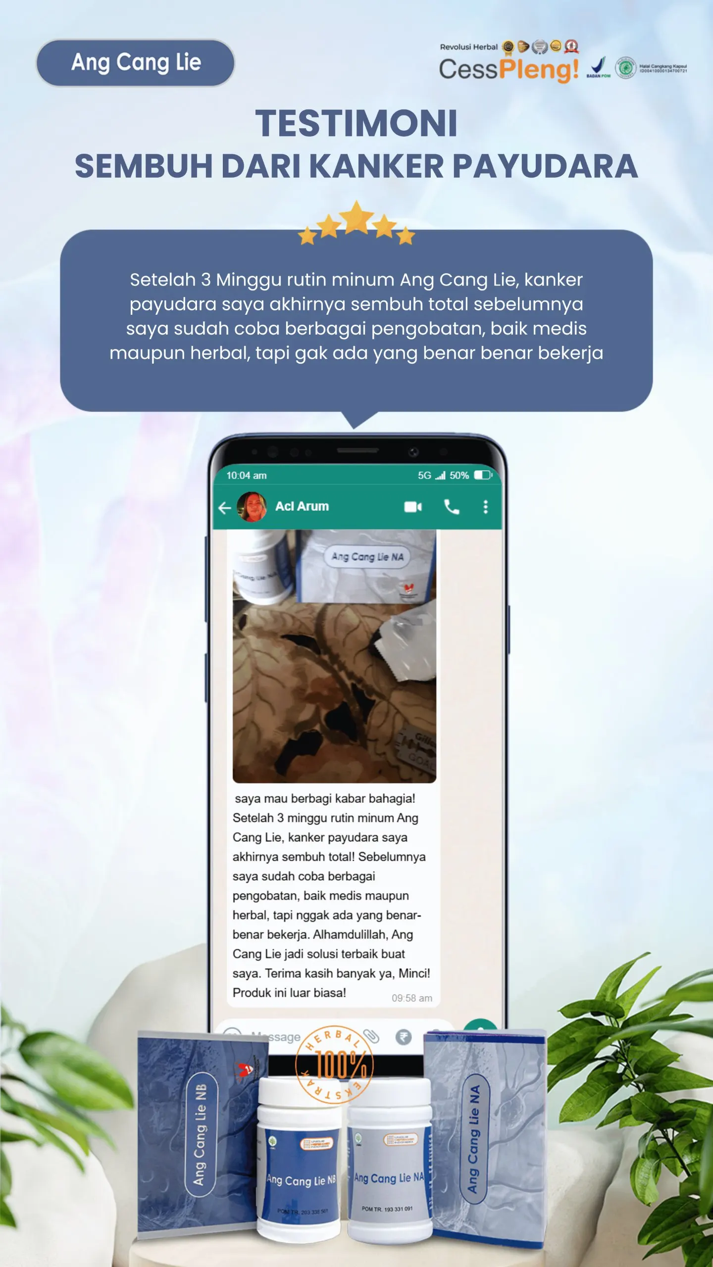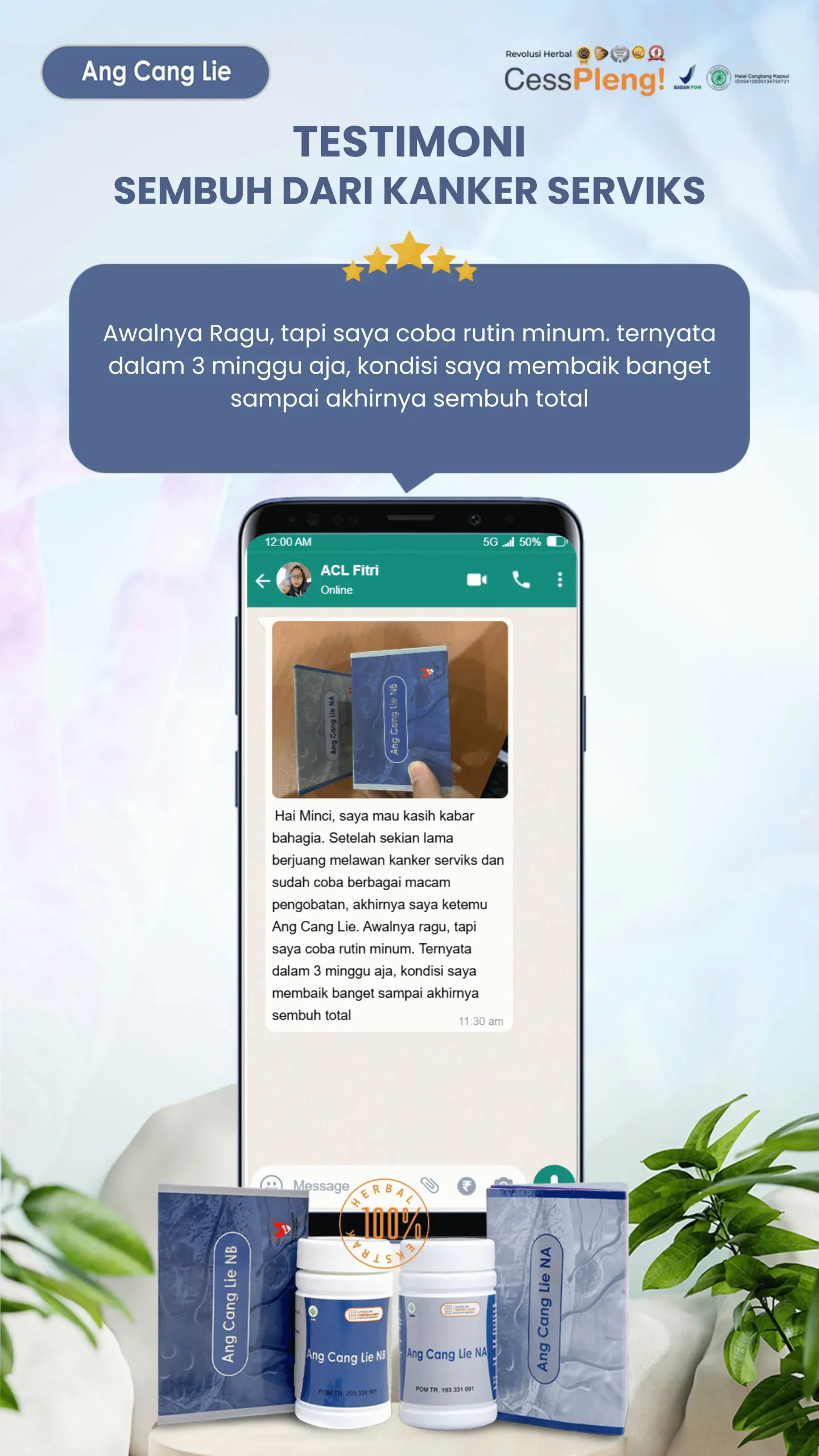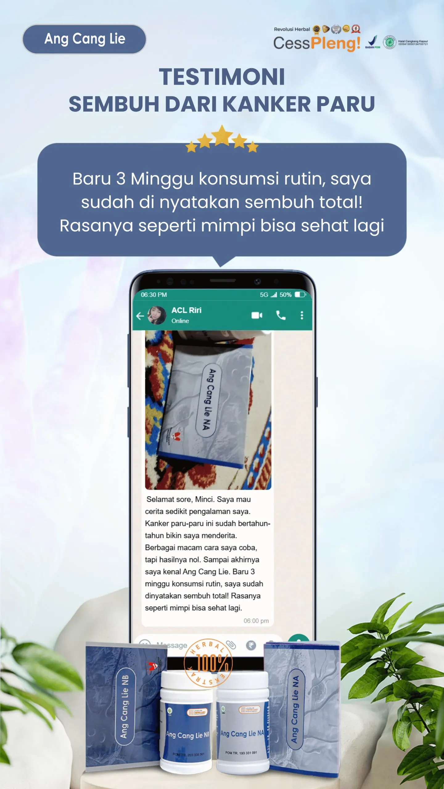 Ang Cang Lie adalah suplemen herbal berbahan alami yang diformulasikan dengan teknologi Herbal Medis Antiangiogenesis konsep modern yang membantu tubuh menjaga keseimbangan pertumbuhan sel, mendukung sistem kekebalan alami, dan membantu proses pemulihan tubuh secara bertahap dari dalam.